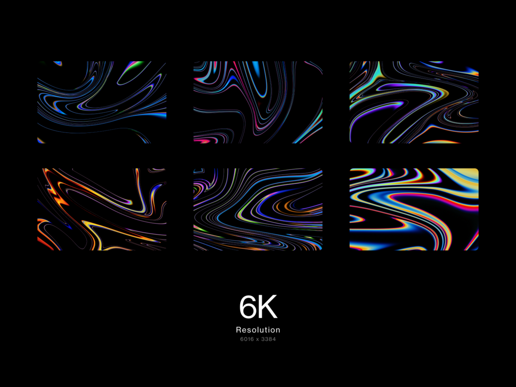 Six ultra high resolution abstract wallpapers (6K - 6016 x 3384 px) . They fit any device from iPhone to Pro Display XDR, while staying perfectly sharp.